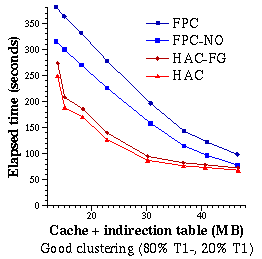 We claim that any performance gains HAC or HAC-FG achieve relative to FPC-NO, when running traversals with equal or lower clustering quality than T1, would be even higher relative to QuickStore. This is true because FPC-NO has low hit time (as low as HAC's), no replacement and conversion overheads, and lower miss rates than QuickStore for traversals with equal or lower clustering quality than T1. In the analysis that follows, we concentrate on the worst-case comparison for HAC - HAC-FG vs. FPC-NO; the gains of HAC relative to a more realistic page-caching system would be higher.